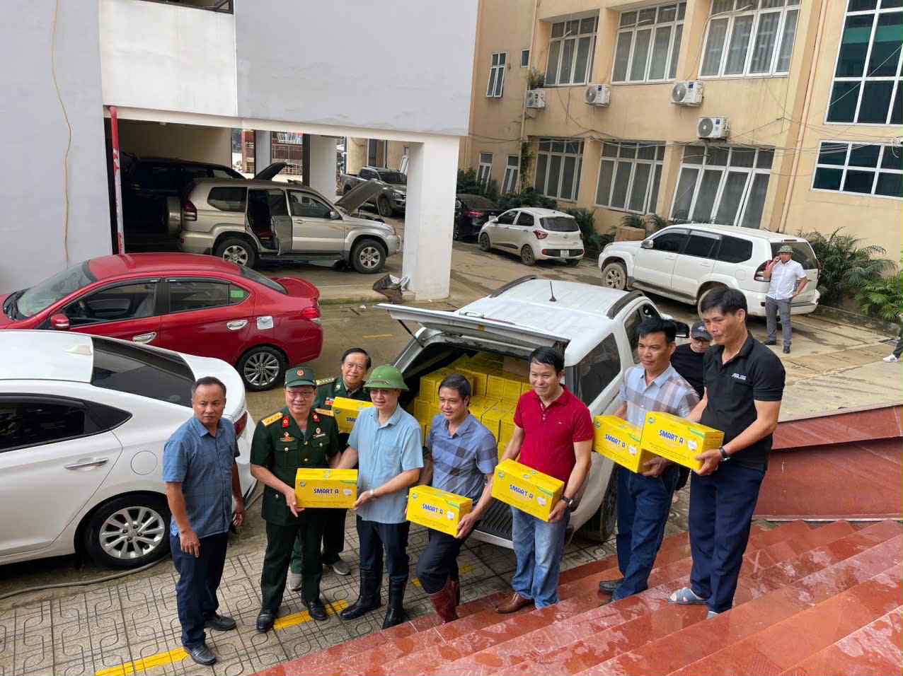 Sáng ngày 12/10, đại diện Hội Quân dân y Việt Nam đã tổ chức đoàn vận chuyển hàng hóa, nhu yếu phẩm đến với người dân Thái Nguyên. Hàng trăm chai nước tinh khiết, thực phẩm dinh dưỡng, hàng chục cân hóa chất khử trùng Cloramin B, hàng nghìn chai nước muối sát khuẩn Smart A... đã được trao đến bà con.