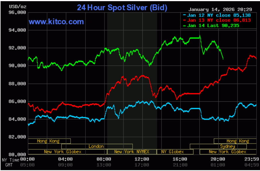 Tại thị trường thế giới, theo kitco.com, tính đến 8 giờ 30 phút sáng 15/1 (giờ Việt Nam), giá bạc tăng mạnh lên mức 90,235 USD/ounce nhờ bất ổn địa chính trị và kỳ vọng nới lỏng chính sách tiền tệ từ Cục Dự trữ Liên bang Mỹ (FED).