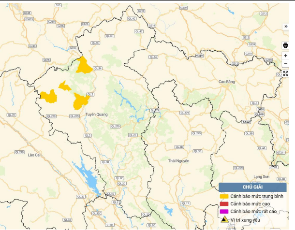 Cảnh báo cấp độ rủi ro thiên tai do lũ quét, sạt lở đất, sụt lún đất do mưa lũ hoặc dòng chảy: Cấp 1.