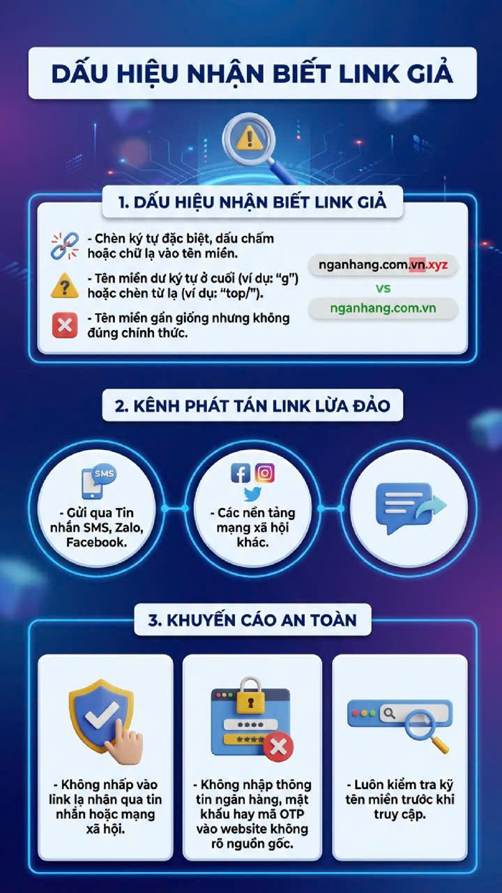 Để tránh sập bẫy lừa đảo, người dân cần tuyệt đối không nhấp vào đường link lạ được gửi qua tin nhắn điện thoại, Zalo hay Facebook. Đồng thời không cung cấp thông tin thẻ ngân hàng, mật khẩu hoặc mã OTP cho các website không rõ nguồn gốc.