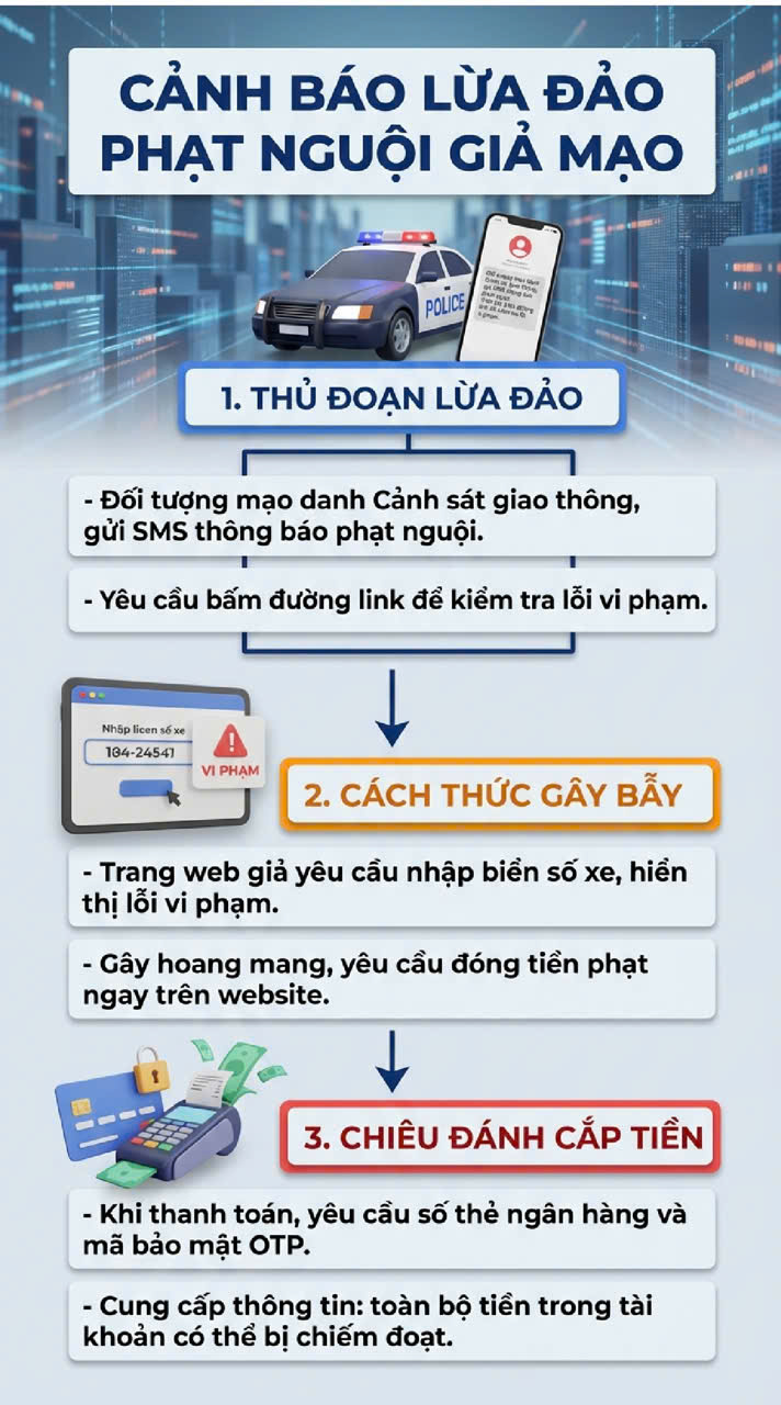 Cơ quan công an cảnh báo người dân về thủ đoạn giả mạo cảnh sát giao thông gửi tin nhắn thông báo “phạt nguội” kèm đường link lạ nhằm đánh cắp thông tin ngân hàng. Chỉ cần truy cập và nhập dữ liệu theo hướng dẫn, nạn nhân có thể bị chiếm đoạt toàn bộ tiền trong tài khoản.