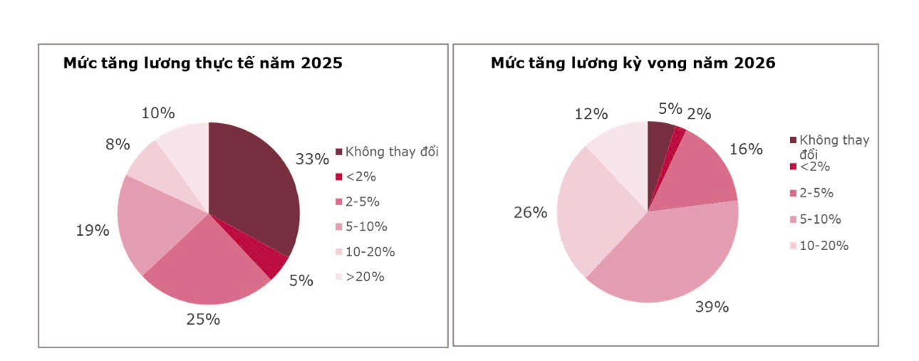 Tuy vậy, bước sang năm 2026, kỳ vọng tăng lương vẫn ở mức cao khi 38% người lao động mong đợi mức tăng trên 10%. Điều này cho thấy lương thưởng tiếp tục là yếu tố quan trọng trong việc thu hút và giữ chân nhân sự.