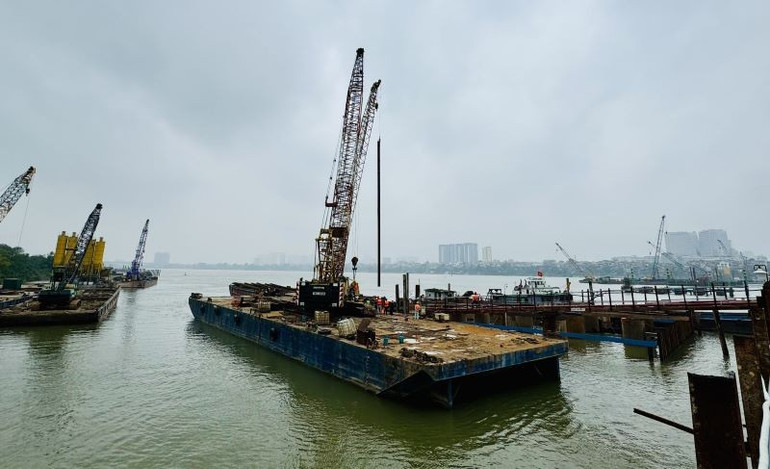 Các nhà thầu cho biết đã bố trí mỗi đơn vị 2 mũi thi công các trụ cầu chính dưới sông Hồng. Hàng trăm kỹ sư, thợ vận hành và cán bộ, công nhân làm việc liên tục xuyên Tết. Cả công trình hiện chỉ còn trụ T1 bên phía phường Hoàn Kiếm chưa thi công được do vướng mặt bằng. Các trụ còn lại đều bảo đảm tiến độ.