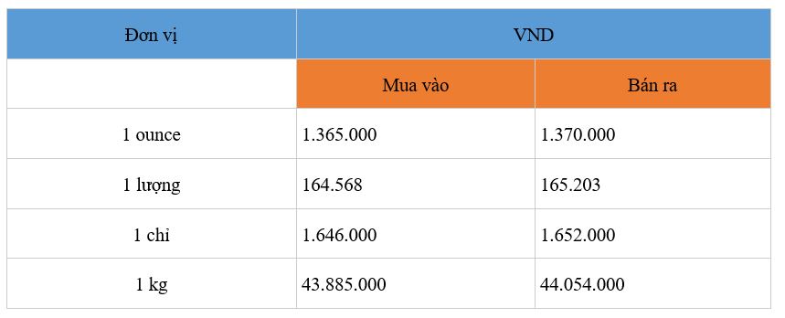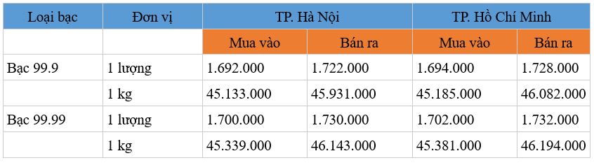 Tại TP. HCM, giá bạc cùng xu hướng tăng, hiện ở mức 1.694.000 đồng/lượng (mua vào) và 1.728.000 đồng/lượng (bán ra).