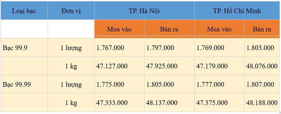 Tại TP. HCM, giá bạc cùng xu hướng tăng, hiện ở mức 1.769.000 đồng/lượng (mua vào) và 1.803.000 đồng/lượng (bán ra).