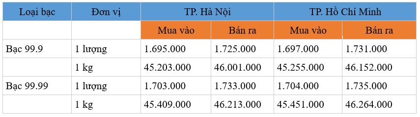 Tại TP. Hồ Chí Minh, giá bạc cùng xu hướng tăng, hiện ở mức 1.697.000 đồng/lượng (mua vào) và 1.731.000 đồng/lượng (bán ra).