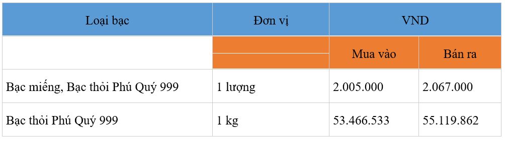 Giá bạc hôm nay tại Tập đoàn Vàng bạc Đá quý Phú Quý, giá bạc tăng, niêm yết ở mức 2.005.000 đồng/lượng (mua vào) và 2.067.000 đồng/lượng (bán ra) tại Hà Nội.