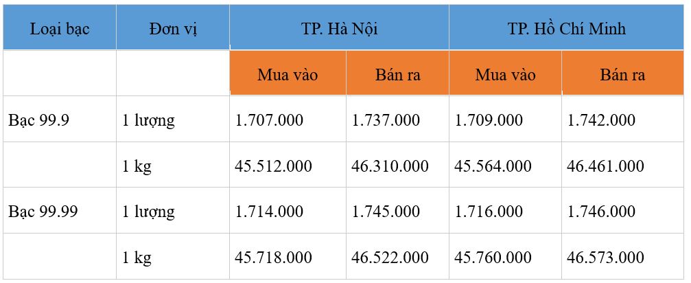 Tại TP. Hồ Chí Minh, giá bạc cùng xu hướng tăng, hiện ở mức 1.709.000 đồng/lượng (mua vào) và 1.742.000 đồng/lượng (bán ra).