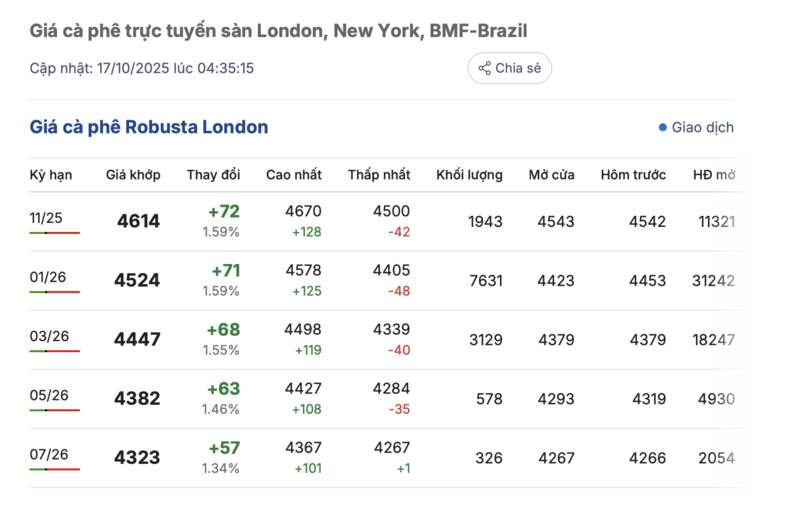 Trên sàn giao dịch London, giá cà phê trực tuyến Robusta hợp đồng giao kỳ hạn tháng 11/2025 đạt 4614 USD/tấn, tăng 1,59% (72 USD/tấn) so với phiên giao dịch trước. Hợp đồng giao kỳ hạn tháng 1/2026 tăng 1,59% (71 USD/tấn), lên mức 4524 USD/tấn.
