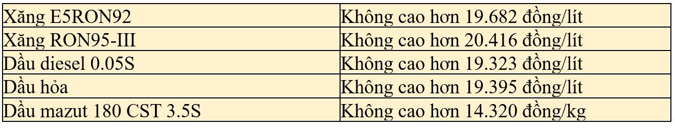 Cụ thể, giá xăng E5RON92 giảm 78 đồng/lít, xăng RON95-III giảm 72 đồng/lít, dầu diesel tăng 120 đồng/lít, dầu hỏa tăng 124 đồng/lít và dầu mazut giảm 319 đồng/kg.