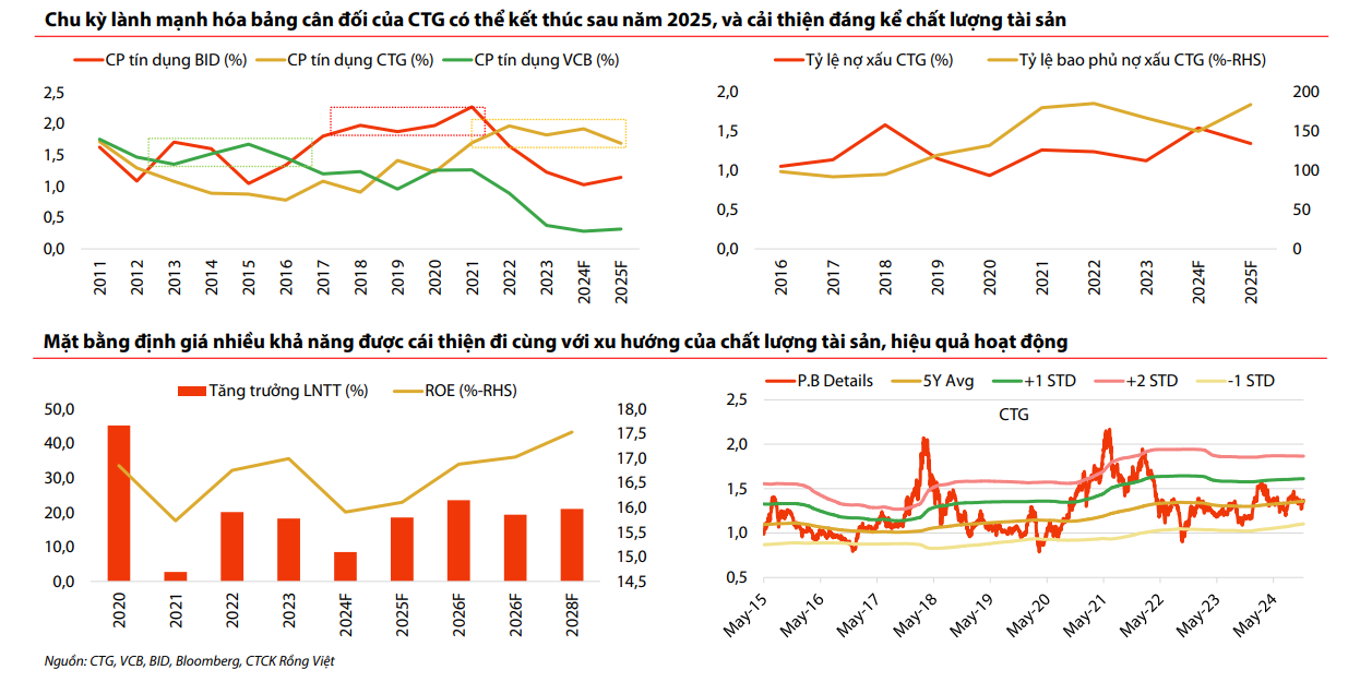 Các ngân hàng quốc doanh thường có chu kỳ “làm sạch” bảng cân đối kế toán một cách sâu rộng (chi phí tín dụng TB mỗi năm từ 1,7%-2%) kéo dài trong khoảng 5 năm. Do đó, VDSC dự phóng chi phí tín dụng bình quân của CTG từ 2025F-28F có thể giảm về mức 1,4% nhờ mặt bằng tỷ lệ nợ xấu giảm, giúp tạo động lực tích cực cho triển vọng tăng trưởng thu nhập.