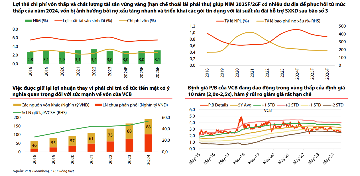 Điểm sáng đầu tiên nằm ở triển vọng thu nhập lãi thuần, khi ngân hàng sở hữu lợi thế hiếm có trên thị trường: chi phí vốn thấp, nhờ tỷ lệ CASA dẫn đầu hệ thống và nguồn vốn giá rẻ từ tiền gửi Kho bạc Nhà nước. Điều này giúp NIM của VCB ít chịu tác động từ biến động thị trường tiền tệ, trong bối cảnh tăng trưởng kinh tế dự kiến thuận lợi hơn trong 1-2 năm tới. Chuyên gia dự phóng NIM của ngân hàng sẽ mở rộng thêm 5-10 điểm cơ bản trong 2025-2026.
