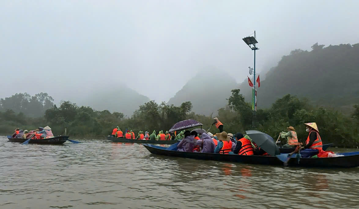 Những chiếc đò nối tiếp nhau xuôi dòng suối Yến, đưa khách hành hương vào trung tâm quần thể di tích. Các điểm đến như chùa Thiên Trù, động Hương Tích ghi nhận lượng khách tăng mạnh so với những ngày trước đó.