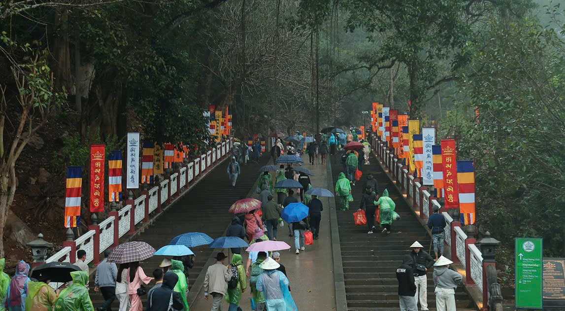 Sáng 22/2 (mùng 6 Tết), ngay từ tinh mơ, dòng người đã đổ về khu danh thắng chùa Hương (xã Hương Sơn, huyện Mỹ Đức, Hà Nội) dự lễ khai hội. Khu vực bến Yến đông kín, du khách xếp hàng chờ xuống thuyền trong tiết trời mưa xuân lất phất.