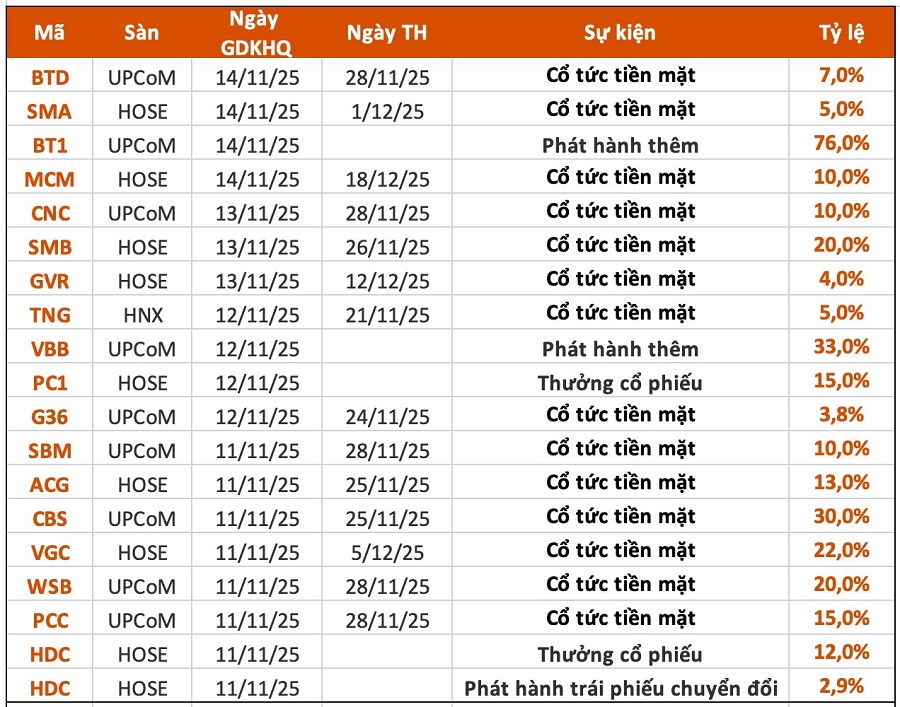 Theo thống kê, có 19 doanh nghiệp thông báo chốt quyền cổ tức trong tuần 10-14/11. Trong đó, 14 doanh nghiệp trả cổ tức bằng tiền mặt trong tuần này, mức cao nhất là 30% và thấp nhất là 3,8%. Ngoài ra có 1 doanh nghiệp trả cổ tức cổ phiếu, 2 doanh nghiệp phát hành thêm và 2 doanh nghiệp thưởng cổ phiếu trong tuần này.