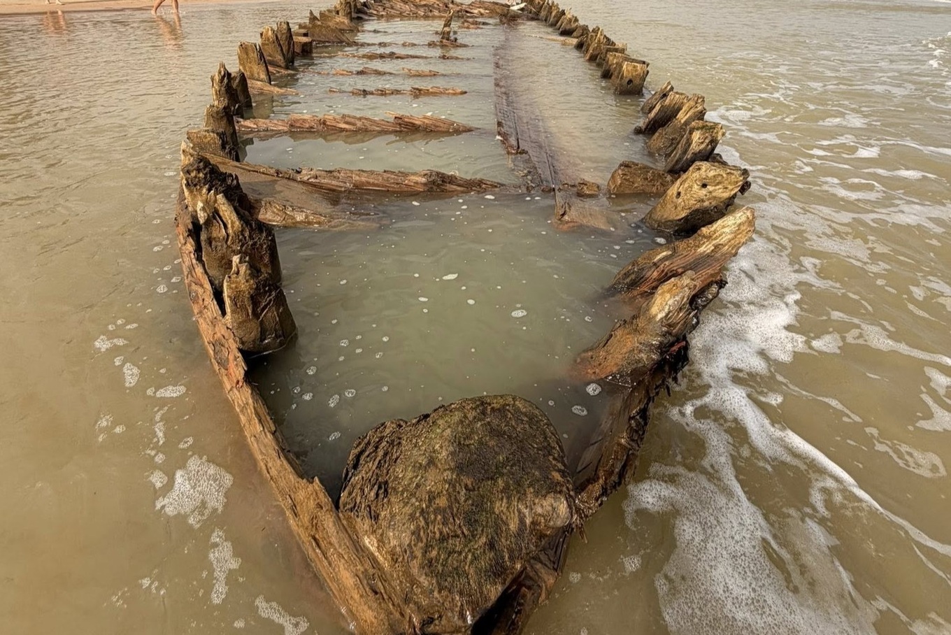 Theo ông Ngọc, con tàu này được phát hiện năm 2023 và các ngành chức năng đã có khảo sát ban đầu. Ngày 8-11, sau cơn bão số 13, con tàu trên một lần nữa bị sóng đánh lộ thiên, hình hài xuất hiện rõ rệt hơn. Tuy nhiên, tới chiều tối cùng ngày, thủy triều lên khiến con tàu cổ lại bị chìm sâu xuống nước, tới sáng nay lộ lên một phần nhưng không rõ như ngày hôm qua.